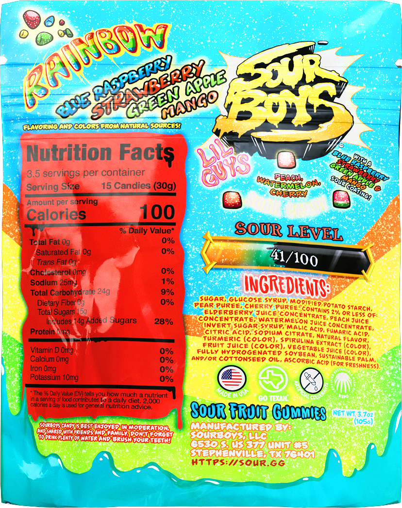 Important: LilGuys do not contain Gluten, however they are manufactured in the same facility as SourBoys, which contain Gluten. Aside from Gluten, there are no major allergens present from our manufacturing process.